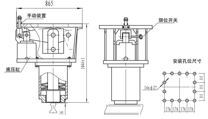 主要設(shè)計(jì)特點(diǎn): 常閉式設(shè)計(jì)、采用液壓站集中驅(qū)動控制以特制碟形彈簧實(shí)現(xiàn)頂軌制動; 摩擦塊采用先進(jìn)的高耐磨鋼,性能可靠; 設(shè)有限位開關(guān),顯示工作狀態(tài); 帶手動釋放,安裝維護(hù)方便。